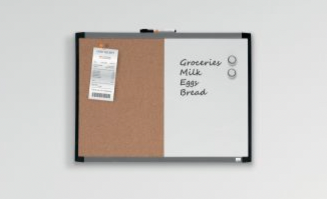 Combination board featuring half magnetic dry-erase and half cork noticeboard surface. Includes 2 x Magnets, 1 x Black Magnetic ReWritable marker with eraser and mounting kit. Stylish plastic frame.