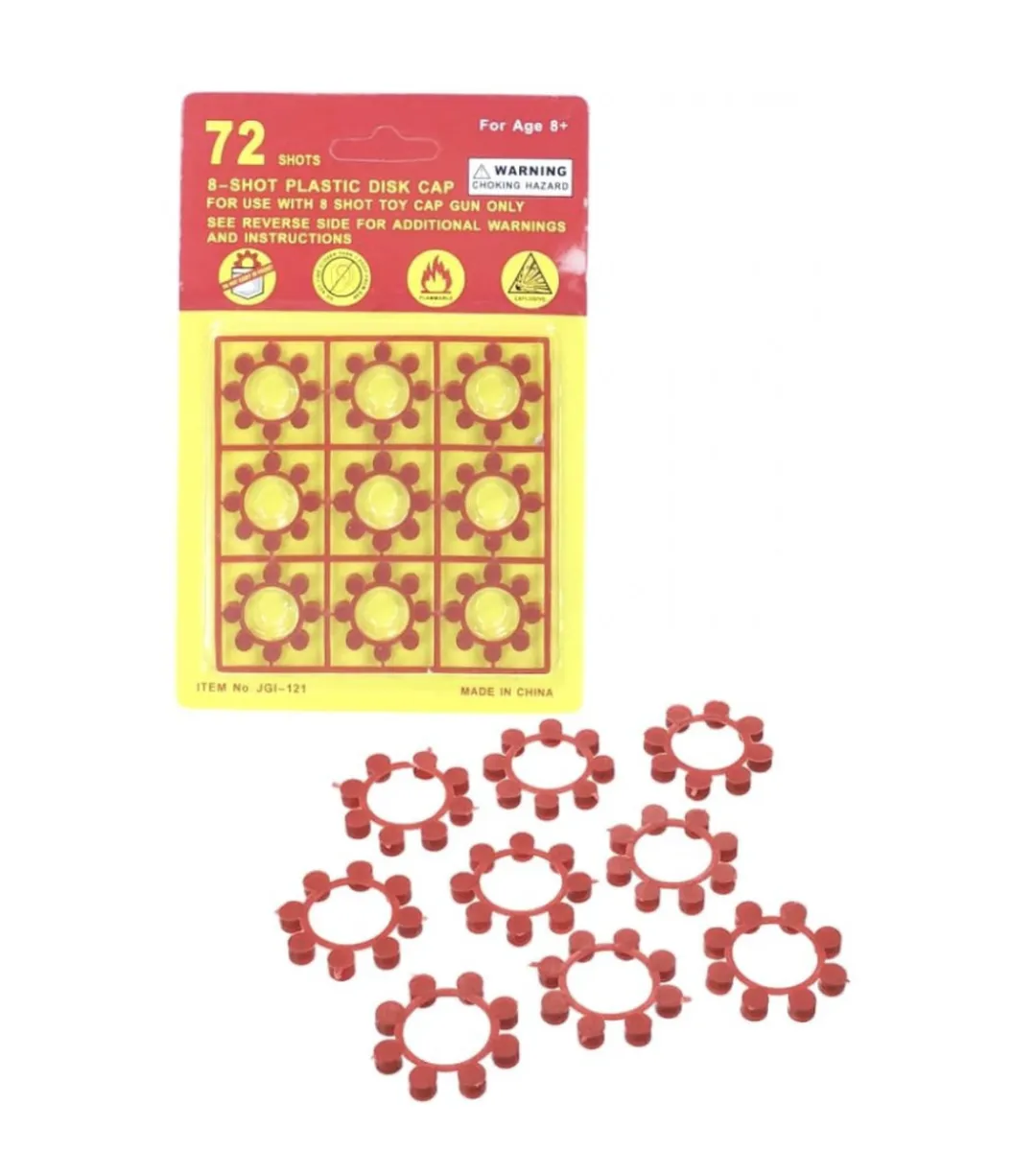 72 shots for our 8 shot Ring Cap Guns. Our loud red ring caps are perfect for your western cap gun! You get 9 red rings with 8 shots on each load for a total of 72 shots. These refills are for the 8 shot ring cap guns. You can also pop these caps apart for use in single shot cap guns and cap bombs. These caps do not work with antique cap guns.