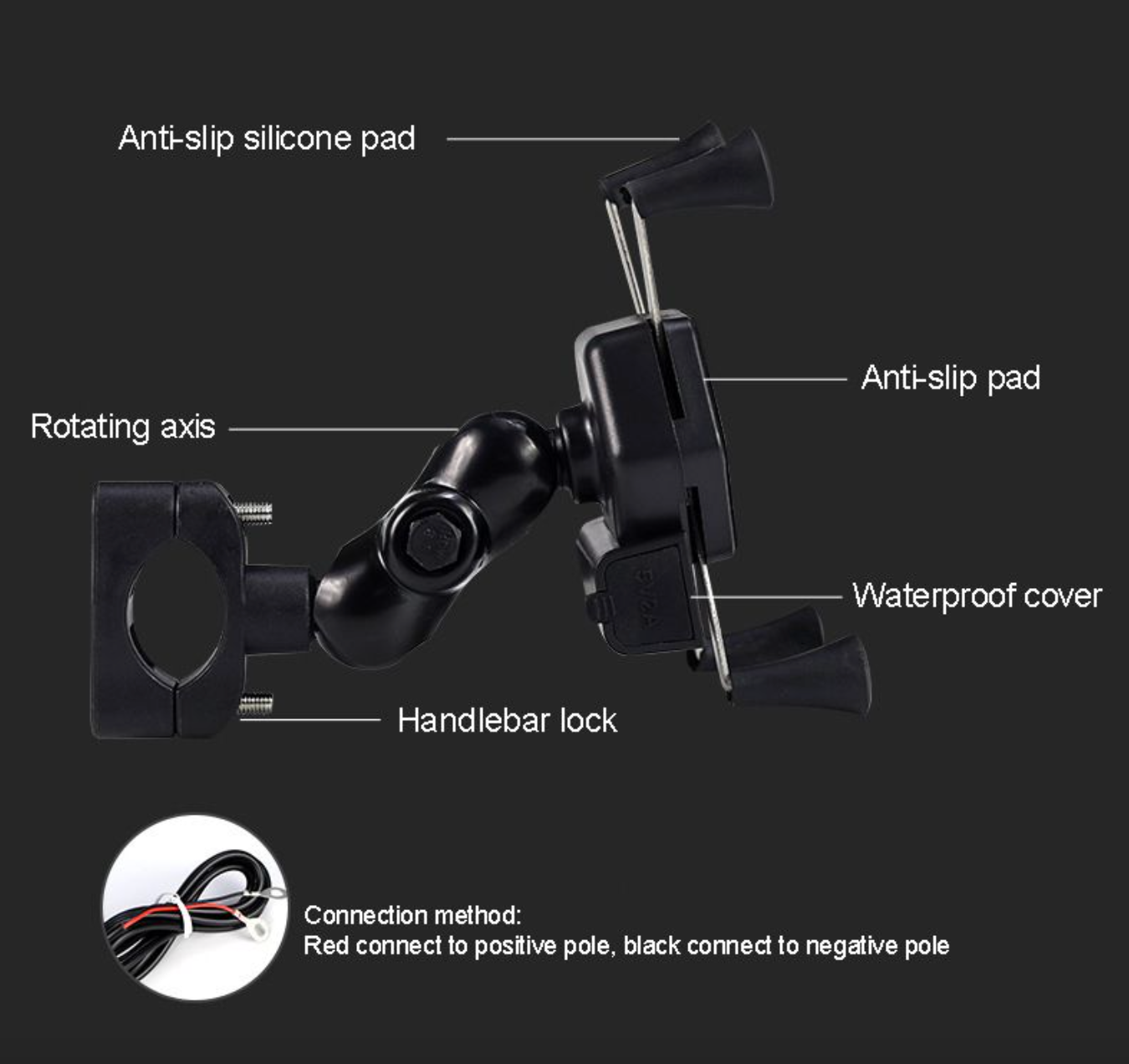 - Phone mount/ holder with USB charger. Output: 5V-2A
