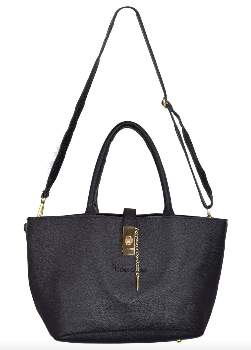 - Vegan Friendly open-top handbag with gold twist-lock & chain detail on front.